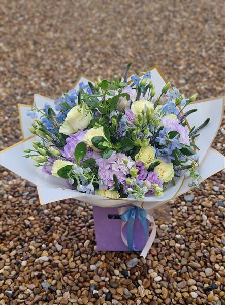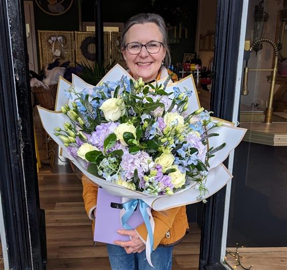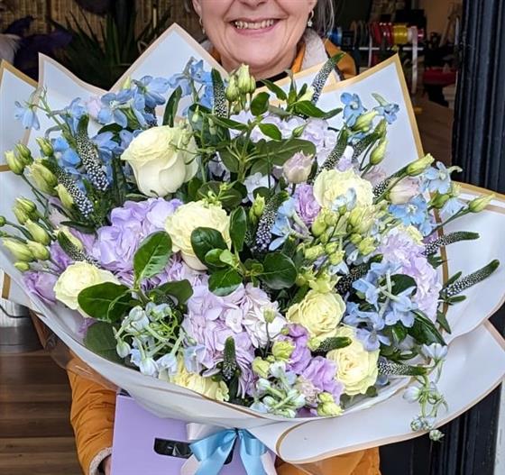 A luxury bouquet including Roses, Hydrangea, Lisianthus, delphinium, Veronica and Eucalyptus.