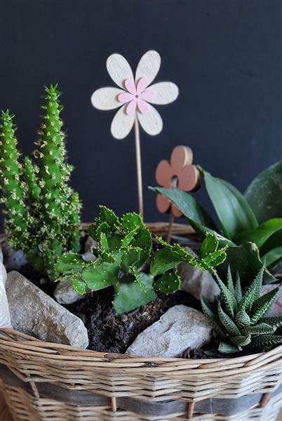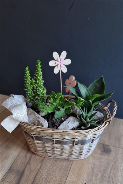 A stunning wicker basket filled with Cactus's and succulent plants.
