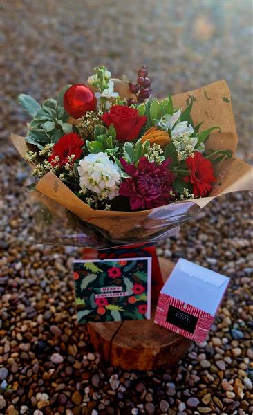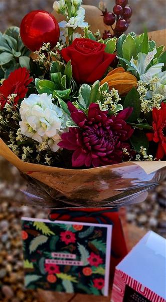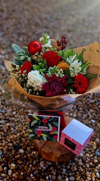 A stunning red, white and plum Christmas hand tied giftset, thoughtfully designed to bring warmth, colour and festive charm.