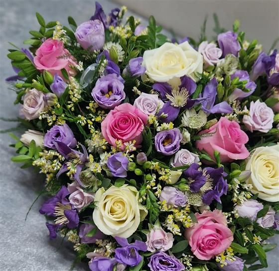 Featuring stunning white and pink roses, delicate lilac lisianthus and scented freesia, this heart tribute is full of beautiful tones.