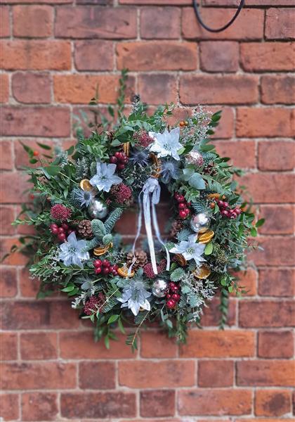 This stunning wreath blends frosted silver tones with festive reds and rich greenery.