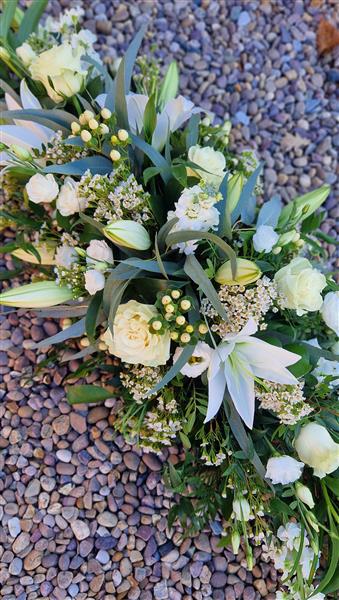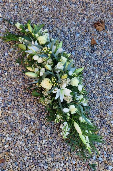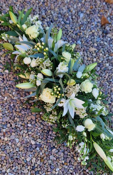 One of our most popular designs, this casket spray is a profusion of neutral blooms including white oriental lilies and white rose.