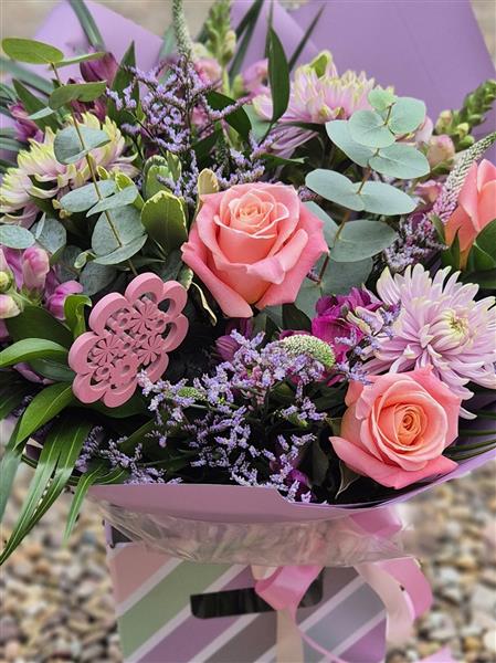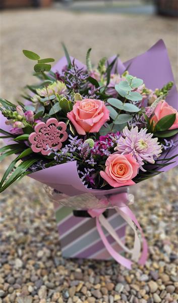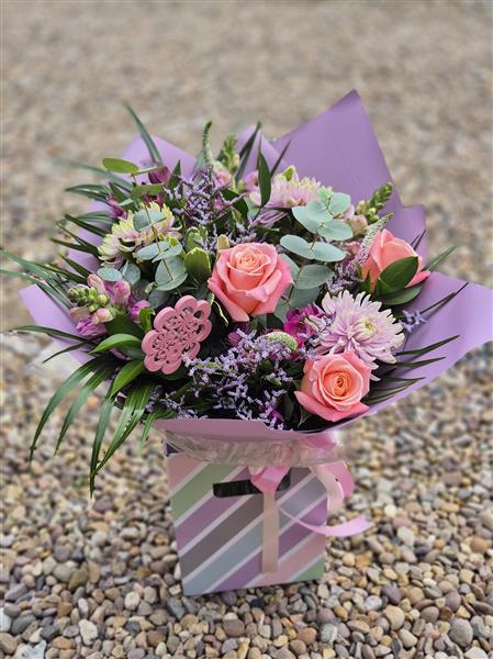 A pastel pink and purple hand tied featuring gorgeous pink rose.