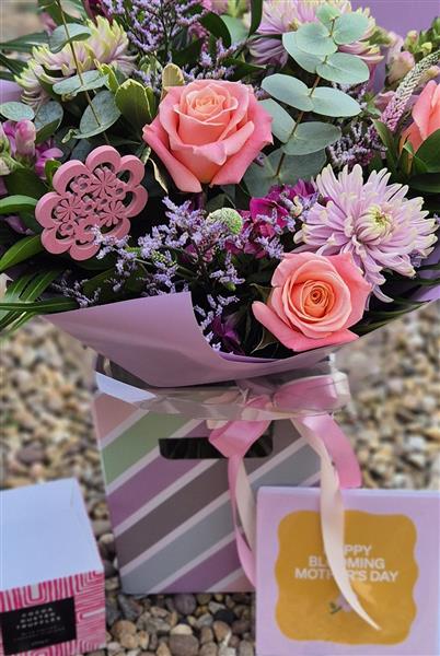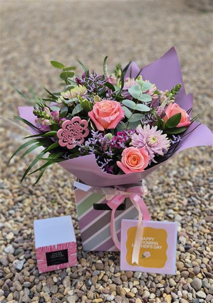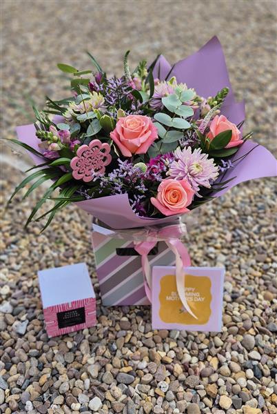 A pastel pink and purple hand tied featuring gorgeous pink rose.