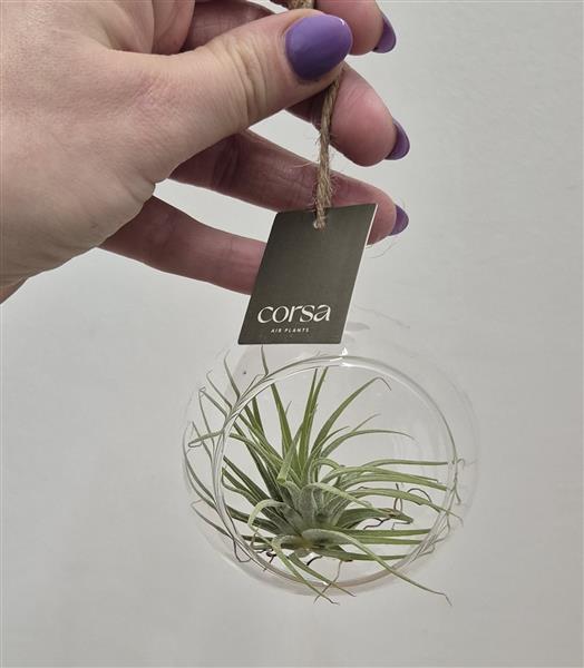 A small air plant in a hanging glass globe.