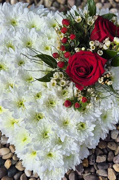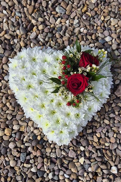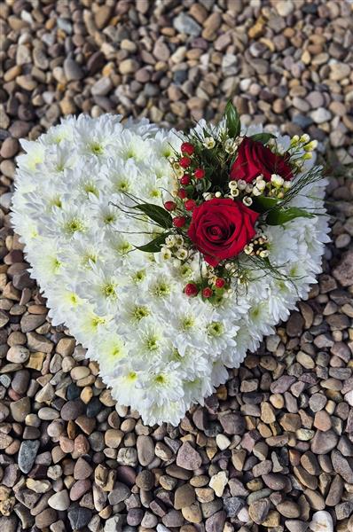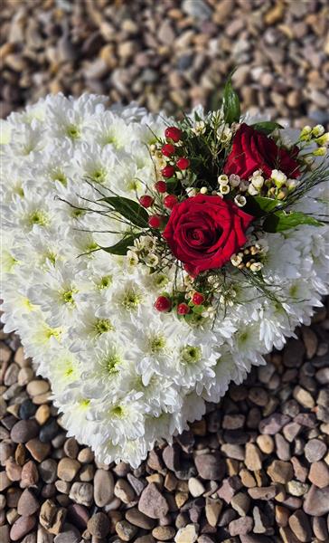 A heart shaped tribute, edged in ribbon with a mass of white spray chrysanthemum and finished with a spray of mixed flower and foliage.